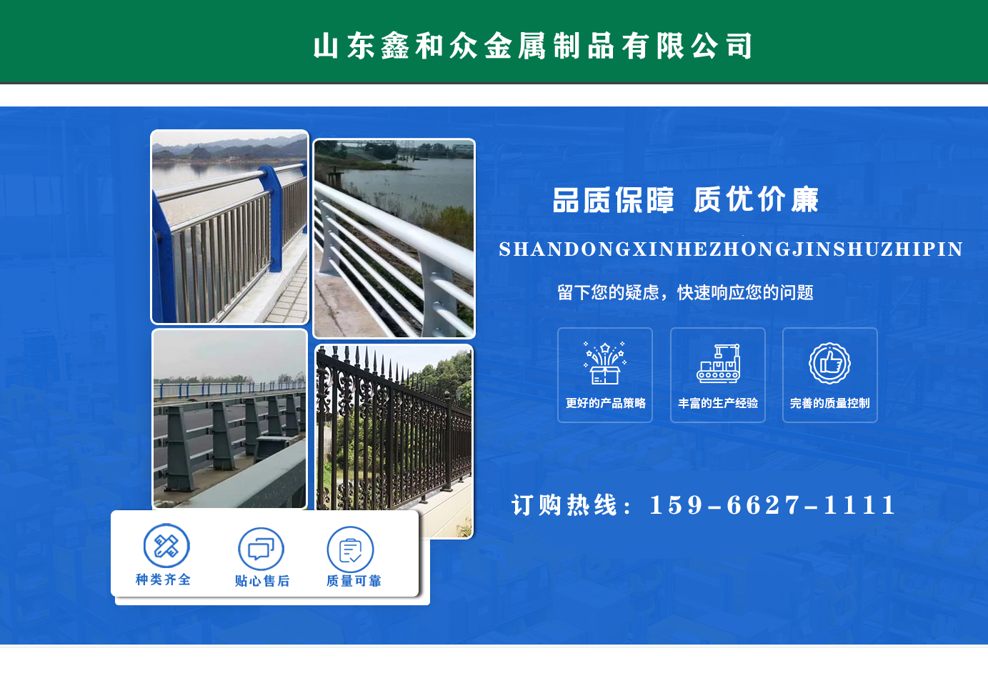 山東鑫和眾金屬制品有限公司主要產(chǎn)品有防撞護欄,橋梁護欄,道路護欄,河道護欄,不銹鋼護欄等護欄。提供設(shè)計方案,一站式定制,包您滿意價格優(yōu)惠,歡迎來電咨詢!    公司常年從事銷售護欄防撞護欄,橋梁護欄,道路護欄,河道護欄,不銹鋼護欄,橋梁鋼護欄,河道燈光護欄等。產(chǎn)品廣泛應(yīng)用于橋梁、河道、旅游景區(qū)、道路、公路、公園、小區(qū)、景觀、道路防撞等領(lǐng)域。    公司產(chǎn)品均采用優(yōu)質(zhì)不銹鋼材料,符合相關(guān)標準。各種型號不銹鋼復(fù)合管及護欄,質(zhì)量嚴格把控。產(chǎn)品強度高、耐腐蝕、焊接牢固、抗沖擊、性能好,防撞護欄結(jié)構(gòu)簡單、美觀實用大方。     歡迎前來訂購!...